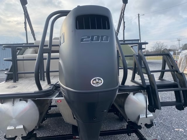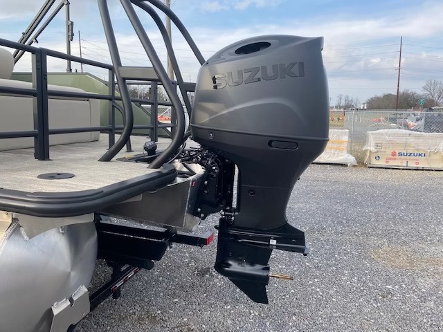 Luxurious black tritoon with Suzuki 200 HP, built for family adventures & entertaining friends. Dual captain swingback lounge & premium features for all-day comfort.