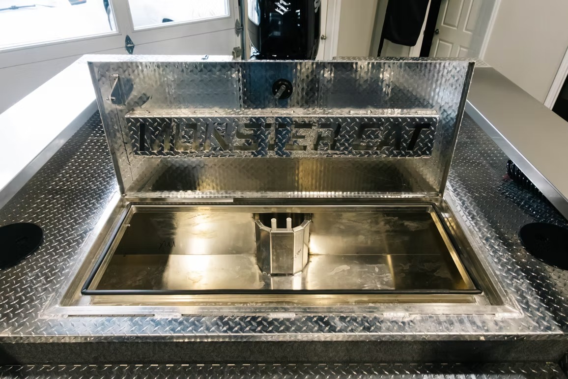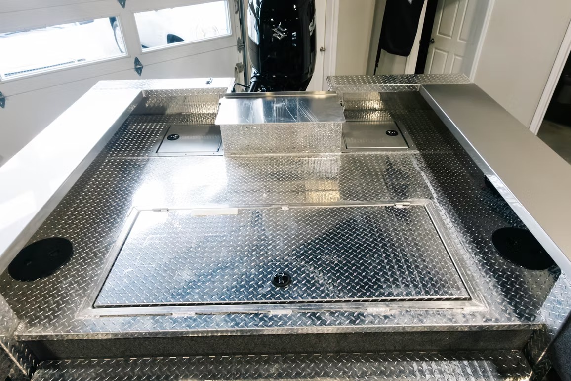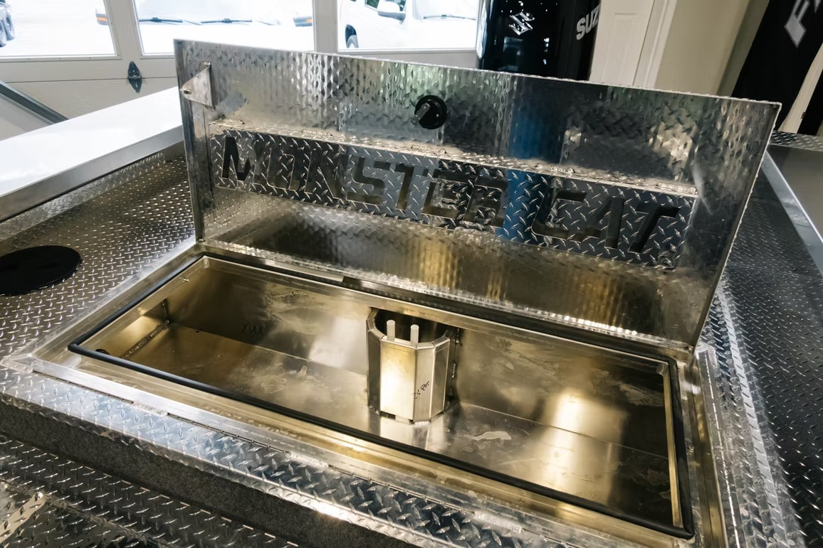 - 90 gallon rear elevated live well with single lid, white LED lighting, and gas shock assist