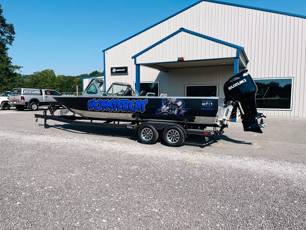 The all-new 2026 Monster Cat 24 is engineered for serious anglers who demand maximum performance on big water. This heavy-duty, all-welded aluminum catfishing platform measures a full 24 feet with an impressive 102" beam, delivering exceptional stability and deck space for multiple anglers, large livewells, and extensive rod storage.
